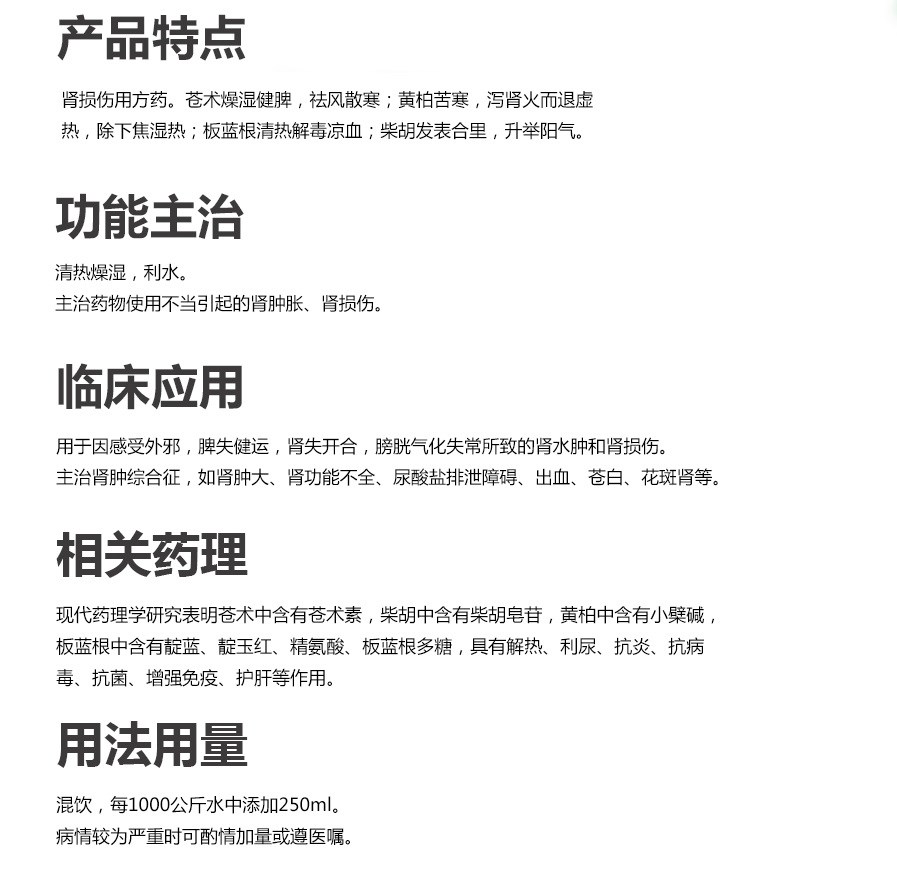 【主治】藥物使用不當(dāng)引起的腎腫脹、腎損傷。
