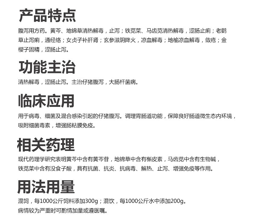 清熱解毒,澀腸止瀉。 主治仔豬腹瀉,大腸桿菌病。